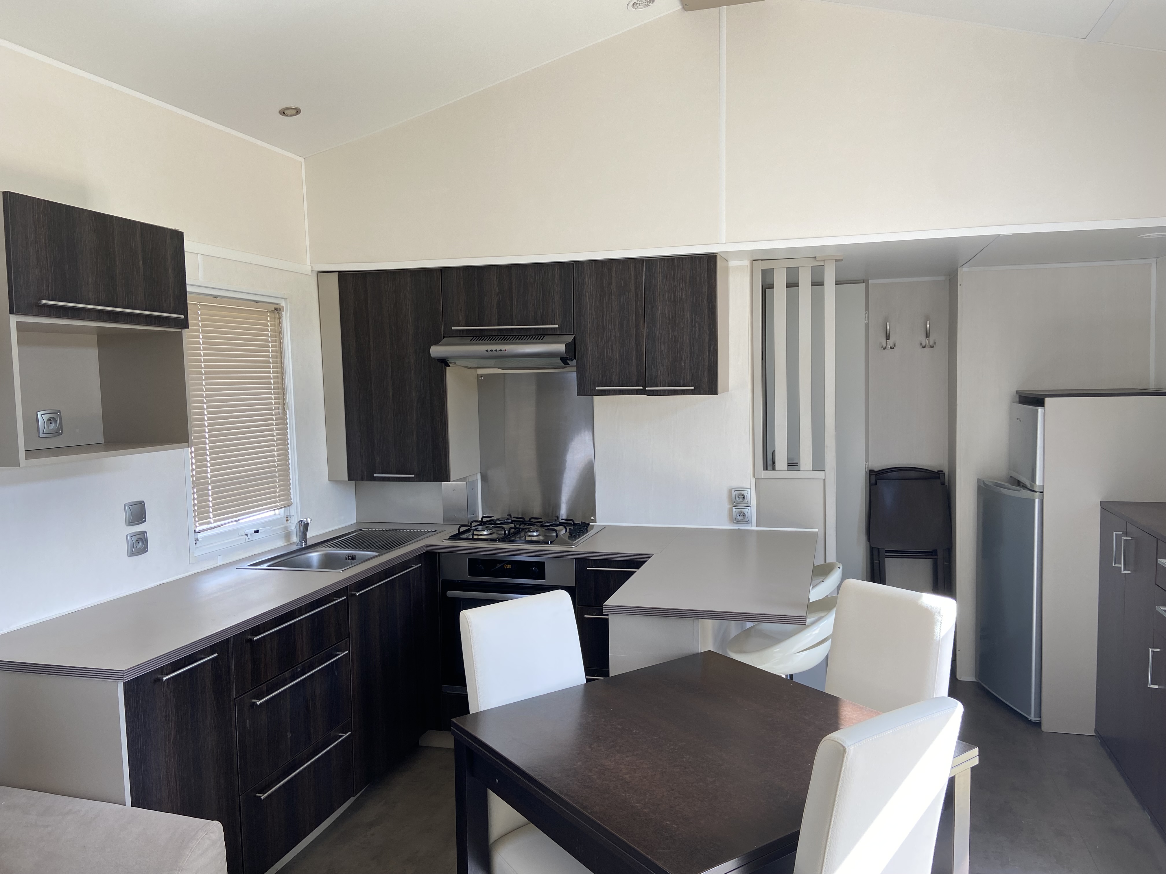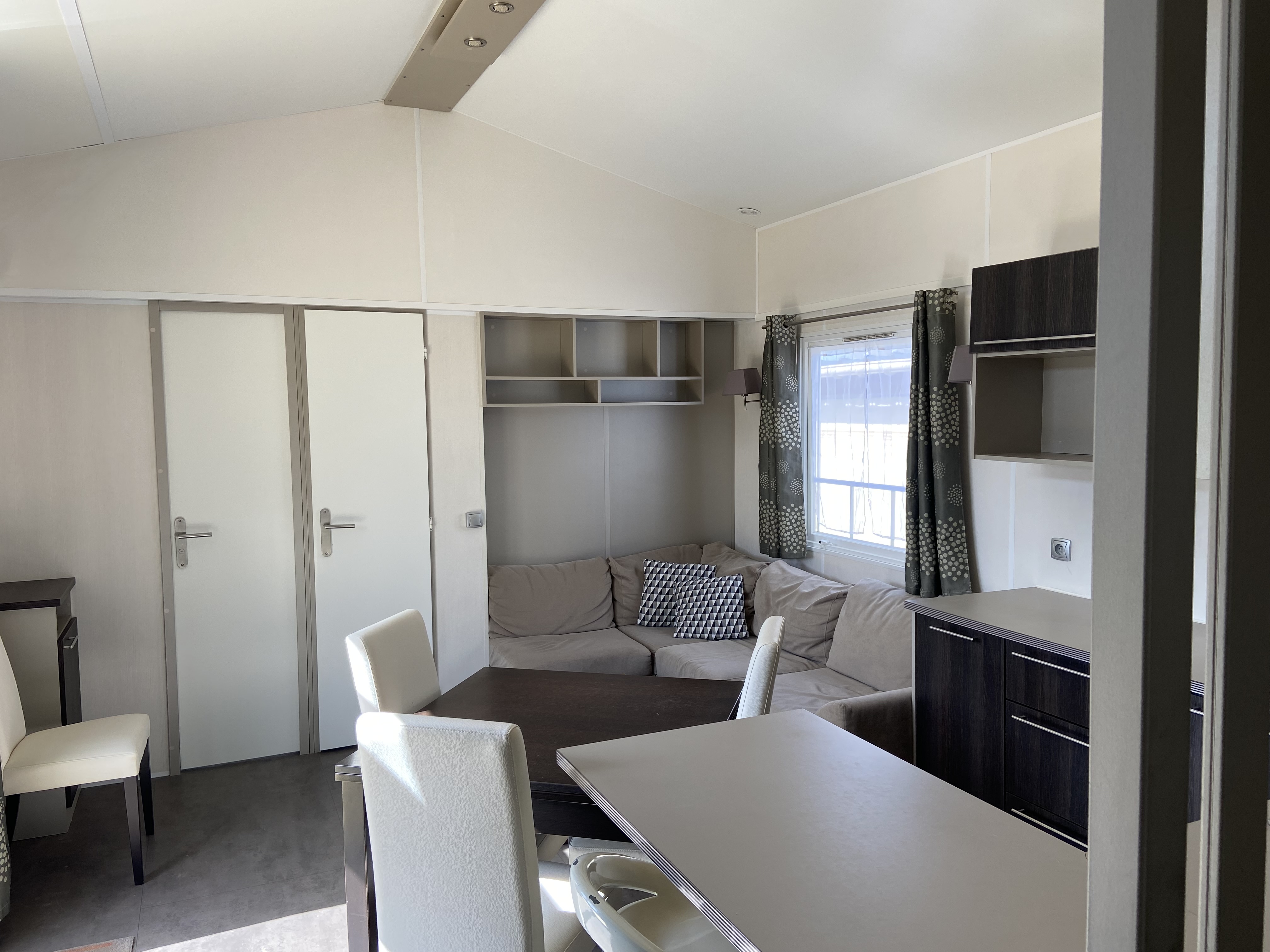 Mobil-home avec salon central avec une grande hauteur sous-plafond, lumineux et spacieux.