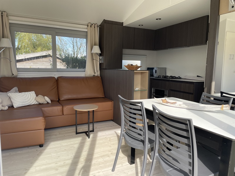Mobil home trés lumineux de part sa grande baie vitrée , canapé convertible et cuisine equipée ( frigo-congélateur intégré,